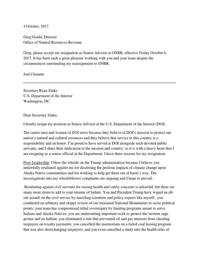 I hereby resign my position as Senior Advisor at the U.S. Department of the Interior (DOI).
