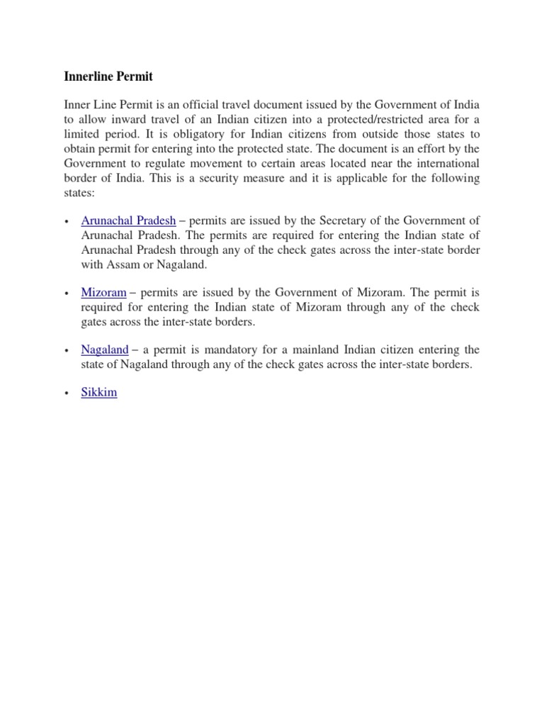 Inner Line Permit is an official travel document issued by the Government of India