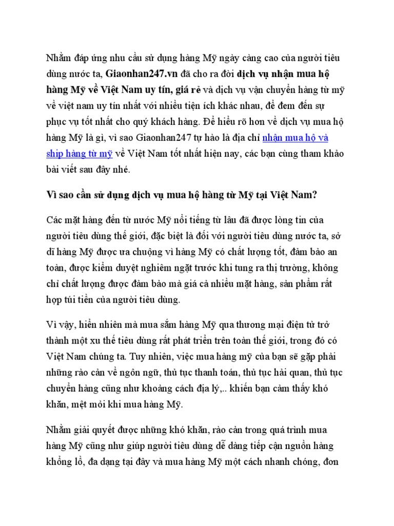 hng M v Vit Nam uy tn, gi r v dch v vn chuyn hng t m v vit nam uy tn nht vi nhiu tin ch khc nhau, em n s phc v tt nht cho qu khch hng. hiu r hn v dch v mua h hng M l g, v sao Giaonhan247 t ho l a ch nhn mua h v ship hng t m v Vit Nam tt nht hin nay, cc bn cng tham kho bi vit sau y nh.