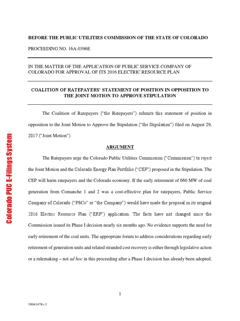3 - CO Proceeding 16A-0396E - Brief On The Ratepayers Coalition in Opposition To The Stipulation