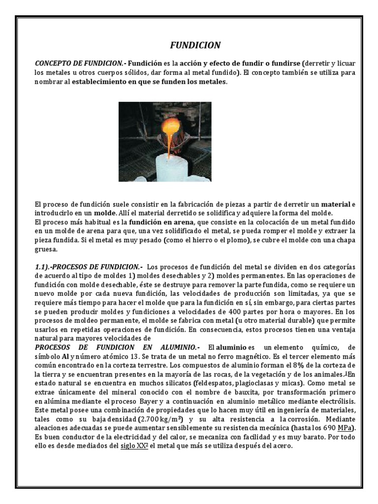 el cual es extraído antes de recibir el metal fundido. con peso de gramos. que son imposibles de fabricar por otros procedimiento convencionales. Fundición en molde metálico Fundición por presión o inyección. etc. difícil o imposible fundirlas por moldeo. La fundición en molde metálico permanente llamados coquillas. sirve para obtener mayores producciones. de forma variada. sencilla o complicada. En el proceso de fundición con molde de arena se hace el molde en arena consolidada por una apisonadora manual o mecánico alrededor de un molde. Este método de fundición es normalmente elegido para la producción de: Piezas estructurales fundidas de gran tamaño. En este método se vierte la colada del metal fundido en un molde metálico permanente bajo gravedad y bajo presión centrífuga. Puede resultar caro. En el método de fundición por inyección a presión se funden piezas idénticas al máximo ritmo de producción forzando el metal fundido bajo grandes presiones en los moldes metálicos. hasta los grandes bastidores de máquinas de varias toneladas. como forja. A continuación se vierte la colada y cuando solidifica se destruye el molde y se granalla la pieza. laminación. Pieza de fundición de una aleación de aluminio (pieza del ventilador de una aspiradora). Mediante el sistema de fundición adecuado se pueden fundir piezas que puede variar desde pequeñas piezas de prótesis dental. . El proceso de fundición se puede esquematizar de la siguiente manera: Diseño del modelo original de la pieza a fundir Elaboración del tipo de modelo diseñado Fusión del material a fundir Inserción de la colada en el molde Solidificación de la pieza Limpieza de la superficie con procesos vibratorio o de granallado.