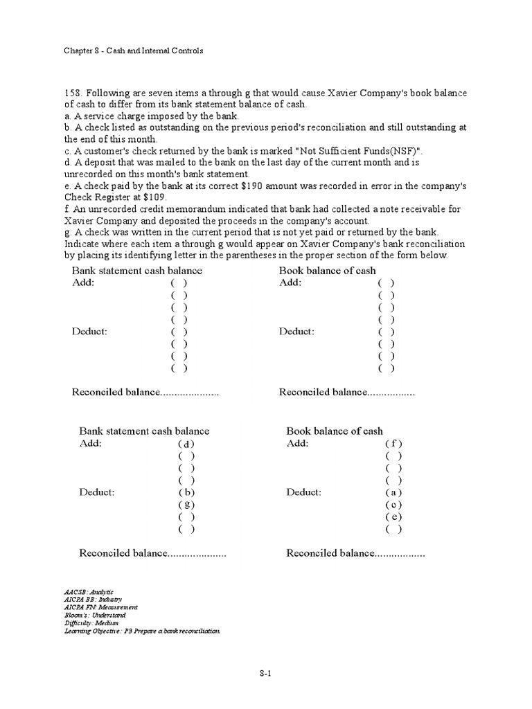 158. Following are seven items a through g that would cause Xavier Company's book balance