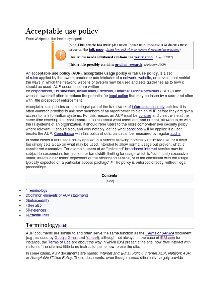 An acceptable use policy (AUP), acceptable usage policy or fair use policy, is a set