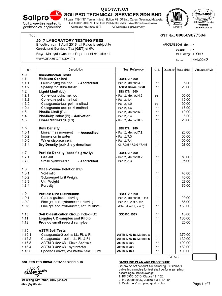 Tel: 603-6188 6975 Fax: 603-6185 5903 eMail: labtest@soilpro.com.my