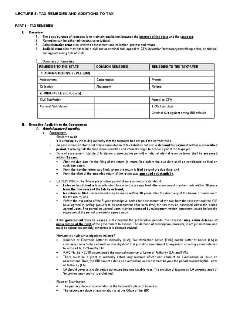 LECTURE 8: TAX REMEDIES AND ADDITIONS TO TAX