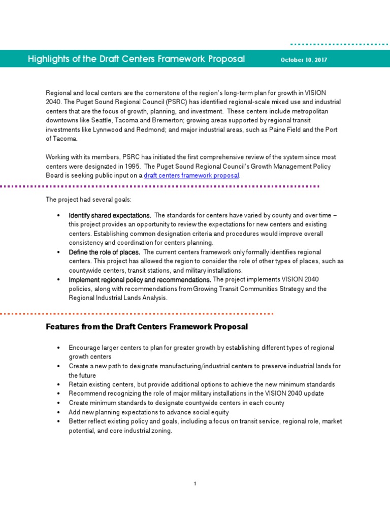 The draft centers framework proposal is available for review on the project webpage, along with other
