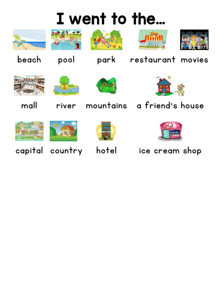 The document lists various locations including the beach, pool, park, restaurant, movies, mall, river, mountains, a friend's house, capital, country, hotel, and ice cream shop without providing any additional context or details about the locations.