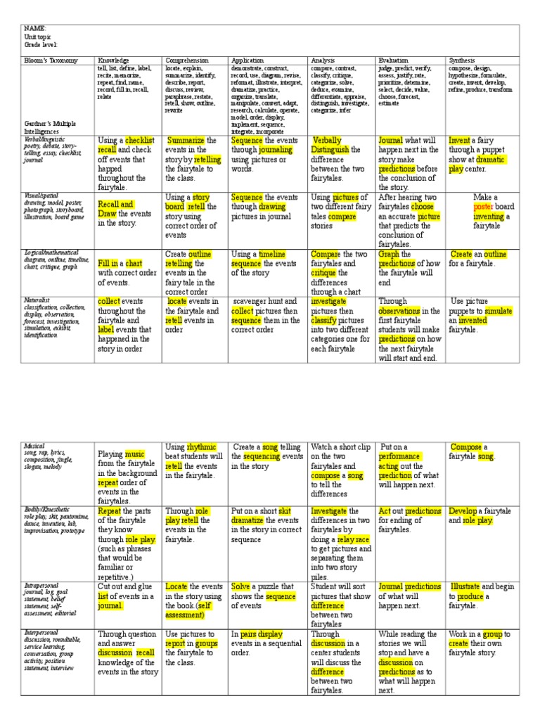 Verbal/linguistic Using a checklist Summarize the Sequence the events Verbally Journal what will Invent a fairy