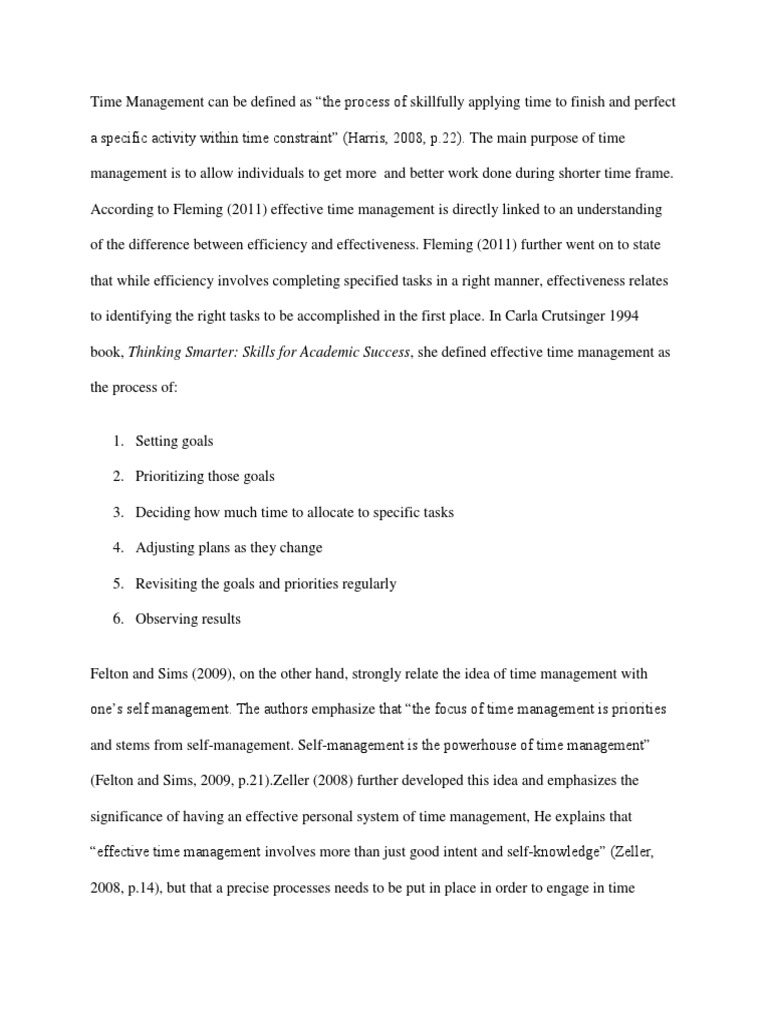 According to Fleming (2011) effective time management is directly linked to an understanding