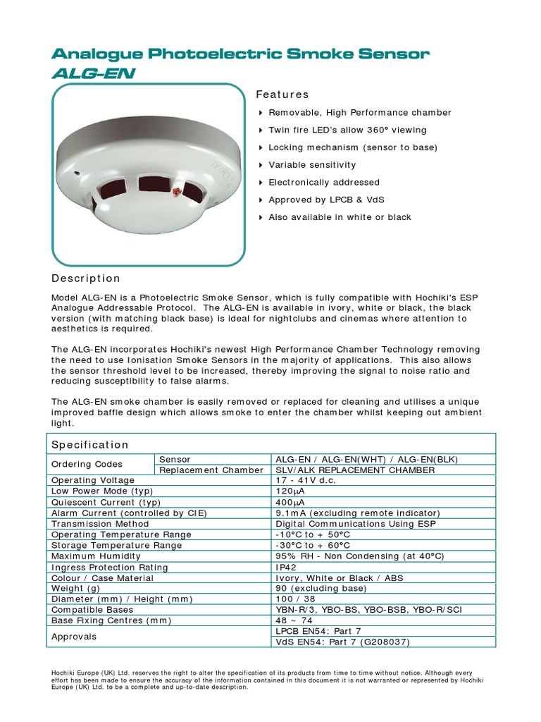 Model ALG-EN is a Photoelectric Smoke Sensor, which is fully compatible with Hochiki's ESP