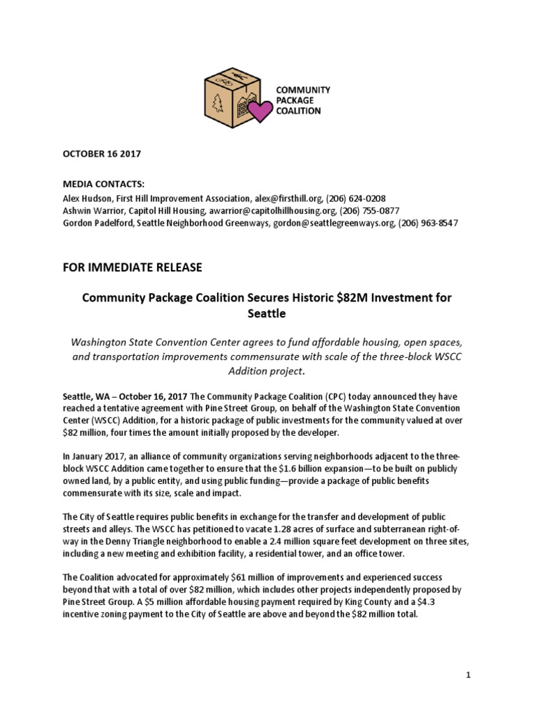 The Community Package Coalition (CPC) today announced they have reached a tentative agreement with Pine Street Group, on behalf of the Washington State Convention Center (WSCC) Addition, for a historic package of public investments for the community valued at over $82 million, four times the amount initially proposed by the developer. In January 2017, an alliance of community organizations serving neighborhoods adjacent to the three-block WSCC Addition came together to ensure that the $1.6 billion expansion—to be built on publicly owned land, by a public entity, and using public funding—provide a package of public benefits commensurate with its size, scale and impact. The City of Seattle requires public benefits in exchange for the transfer and development of public streets and alleys. The WSCC has petitioned to vacate 1.28 acres of surface and subterranean right-of-way in the Denny Triangle neighborhood to enable a 2.4 million square feet development on three sites, including a new meeting and exhibition facility, a residential tower, and an office tower. The Coalition advocated for approximately $61 million of improvements and experienced success beyond that with a total of over $82 million, which includes other projects independently proposed by Pine Street Group. A $5 million affordable housing payment required by King County and a $4.3 incentive zoning payment to the City of Seattle are above and beyond the $82 million total.