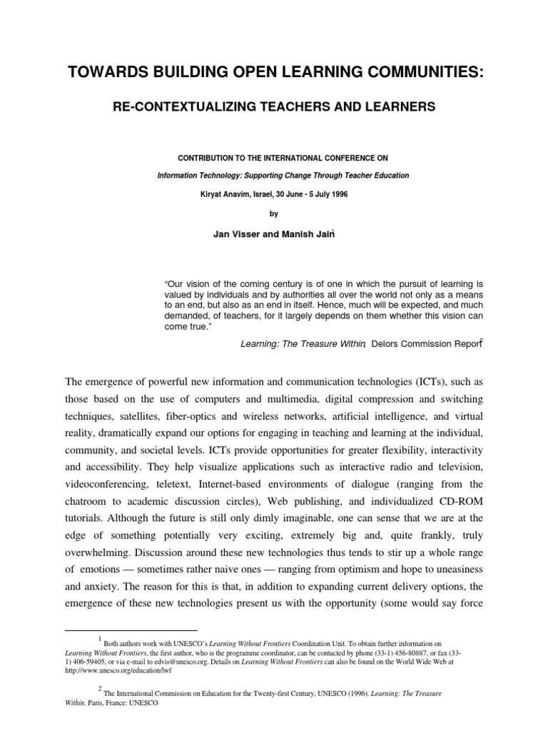 Education Development Center; Visser, J. (1995). Can new technologies lower the barriers to quality education for all? In S. Anzalone