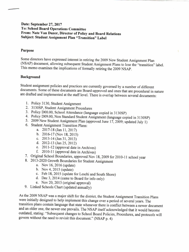 Date: September 27, 2017 To: School Board Operations Committee From: Nate Van Duzer, Director of Policy and Board Relations Subject: Student Assignment Plan “Transition” Label Purpose Some directors have expressed interest in retiring the 2009 New Student Assignment Plan (NSAP) document, allowing subsequent Student Assignment Plans to lose the “transition” label, ‘This memo examines the implications of formally retiring the 2009 NSAP. Background Student assignment policies and practices are currently governed by a number of different documents. Some of these documents are Board-approved and ones that are procedural in nature are drafted and implemented at the staff level. There is overlap between several documents: Policy 3130, Student Assignment 31308P, Student Assignment Procedures Policy D00.00, School Attendance (language copied in 3130SP) Policy D09.00, Non Standard Student Assignment (language copied in 3130SP) 2009 New Student Assignment Plan (approved June 17, 2009; updated July 1) Student Assignment Transition Plans: 2017-18 (Jan 11, 2017) 2016-17 (Nov 18, 2015) 2013-14 (Jan 31, 2013) 2012-13 (Jan 25, 2012) 2011-12 (approval date in Archives) £. 2010-11 (approval date in Archives) 7. Original School Boundaries, approved Nov 18, 2009 for 2010-1! school year 2013-2020 Growth Boundaries for Student Assignment Nov 16, 2016 (update) Nov 4, 2015 (update) Feb 18, 2015 (update for Leschi and South Shore) Dec 3, 2014 (came to Board for info only) . Nov 20, 2013 (original approval) 9. Linked Schools Chart (updated annually) aveeye saege As the 2009 NSAP was a major shift for the district, the Student Assignment Transition Plans were initially designed to help implement this change over a period of several years. The transition plans contain language that state whenever there is conflict between a newer document and an older one, the newer one prevails. The NSAP itself acknowledged that it would become ‘outdated, stating: “Subsequent changes to School Board Policies, Procedures, and protocols will govern without the need to revisit this document.” (NSAP p. 4)