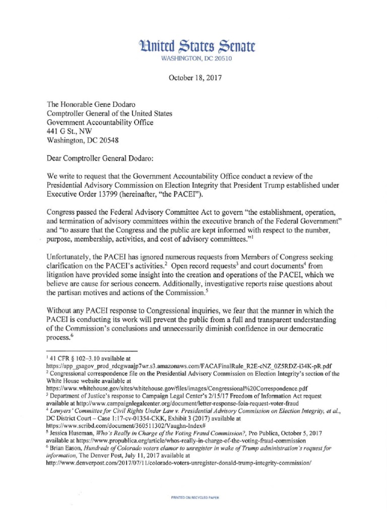 U.S. Senators Michael Bennet (D-CO), Amy Klobuchar (D-MN), and Cory Booker (D-NJ) today sent a letter to the U.S. Government Accountability Office (GAO), a nonpartisan, independent agency, requesting its review of the Presidential Advisory Commission on Election Integrity.