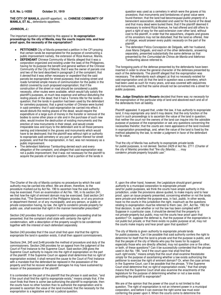 The City of Manila must meet two conditions to exercise eminent domain: the land must be private, and the purpose must be public. Courts have the authority to examine these conditions during trials to ensure the right to exercise eminent domain exists. Judicial oversight is necessary to protect constitutional rights, and the courts can intervene if land is being taken for non-public use or without necessity .