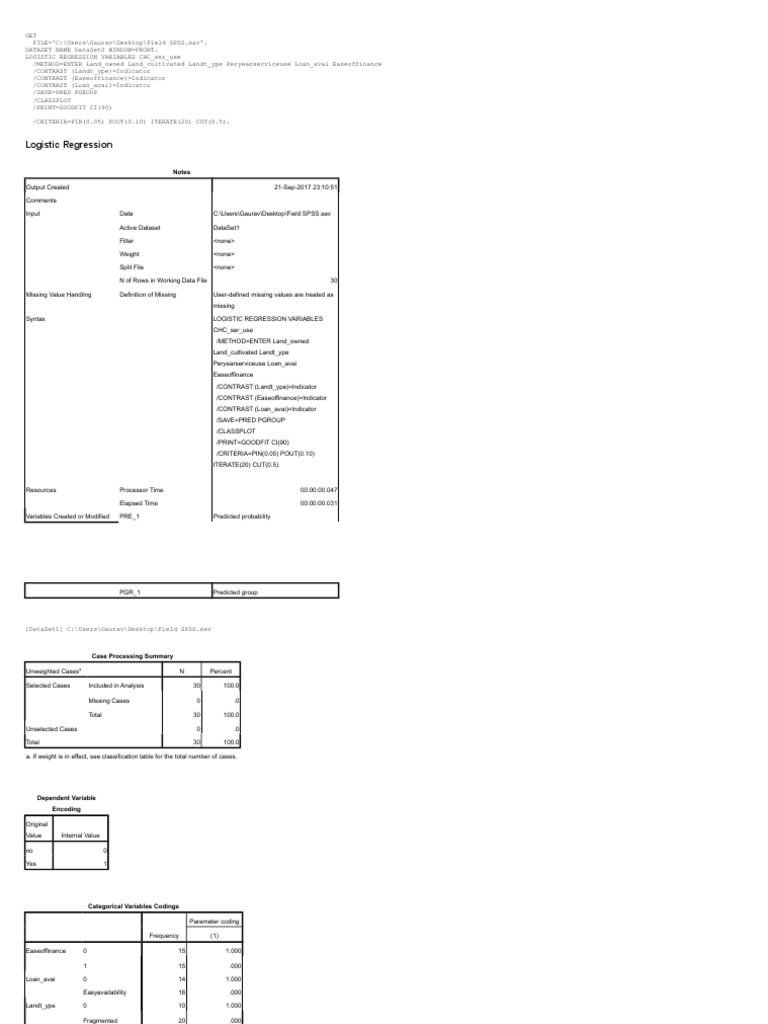 /METHOD=ENTER Land_owned Land_cultivated Landt_ype Peryearserviceuse Loan_avai Easeoffinance