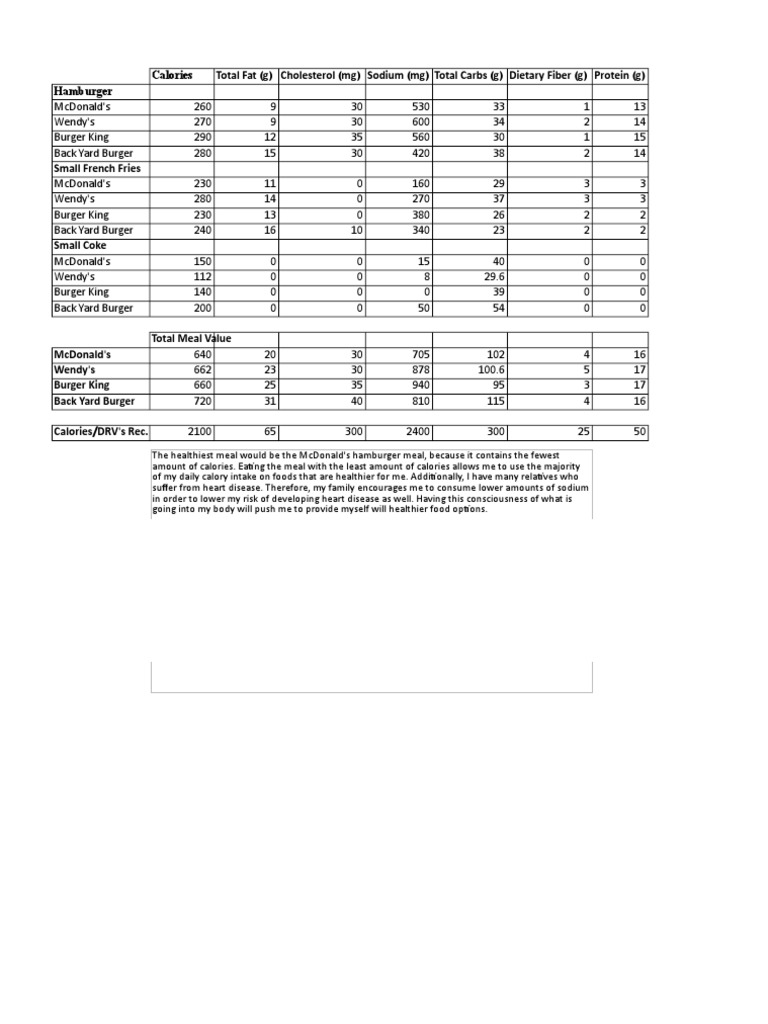 The healthiest meal would be the McDonald's hamburger meal, because it contains the fewest