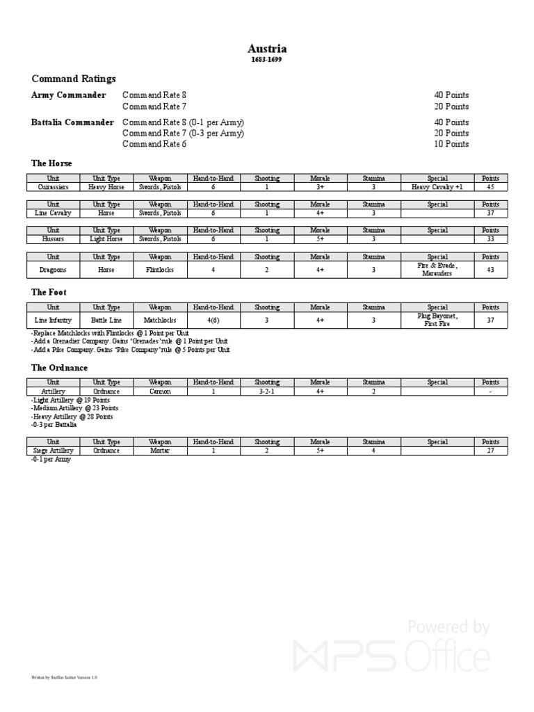 Cuirassiers Heavy Horse Swords, Pistols 6 1 3+ 3 Heavy Cavalry +1 45