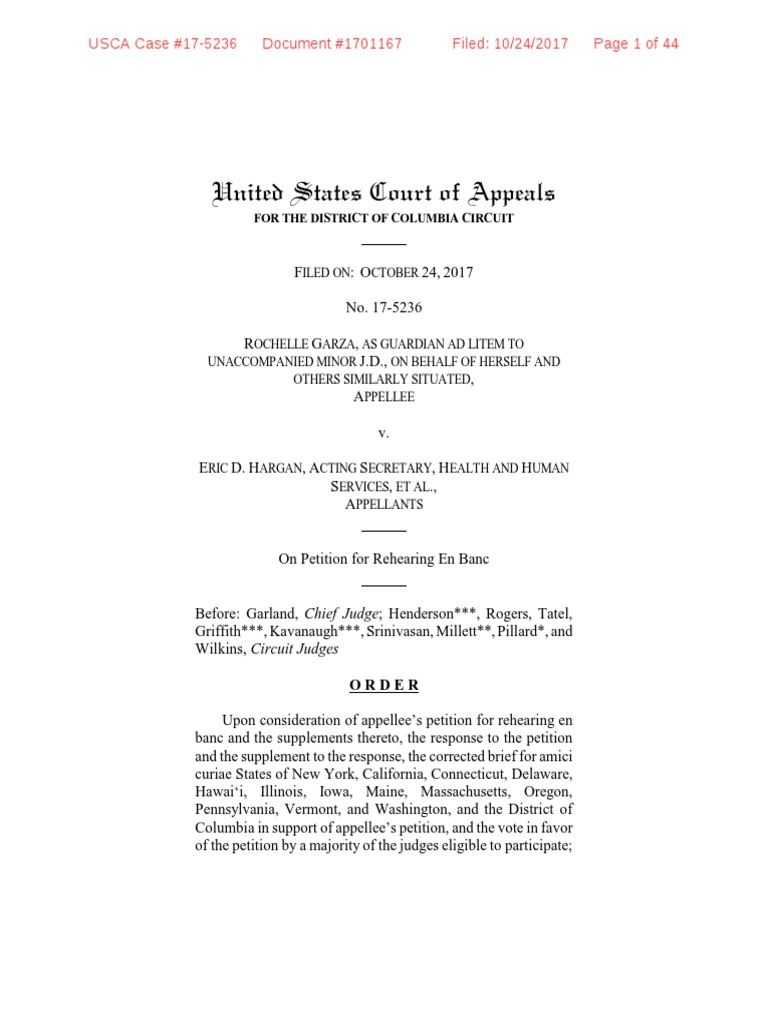 This document is an order from the United States Court of Appeals for the District of Columbia Circuit regarding a case involving a pregnant unaccompanied minor in federal custody seeking an…