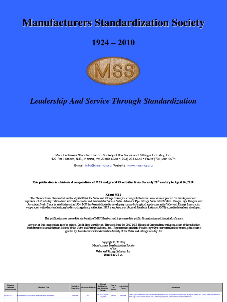 (Oct.)1912; adopted Created by the Committee of Manufacturers on Standardization Pipe Fittings and Valves (CMSPFV), the original name of MSS. 100,000 copies were printed of