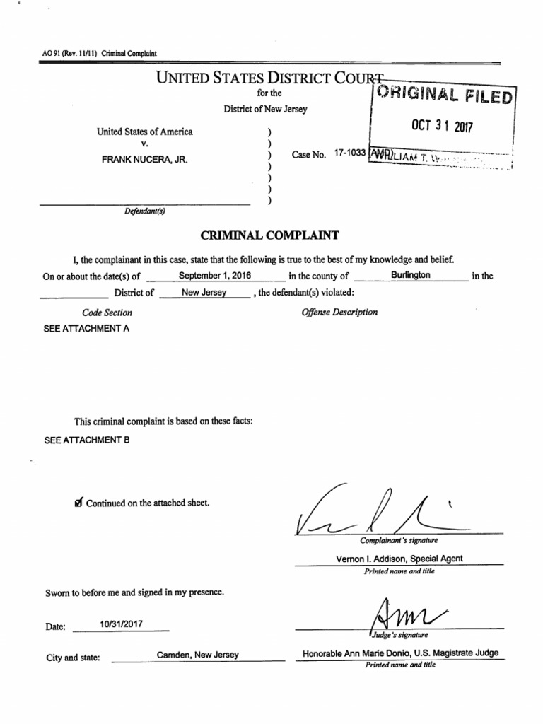 Criminal complaint against Frank Nucera Jr.
