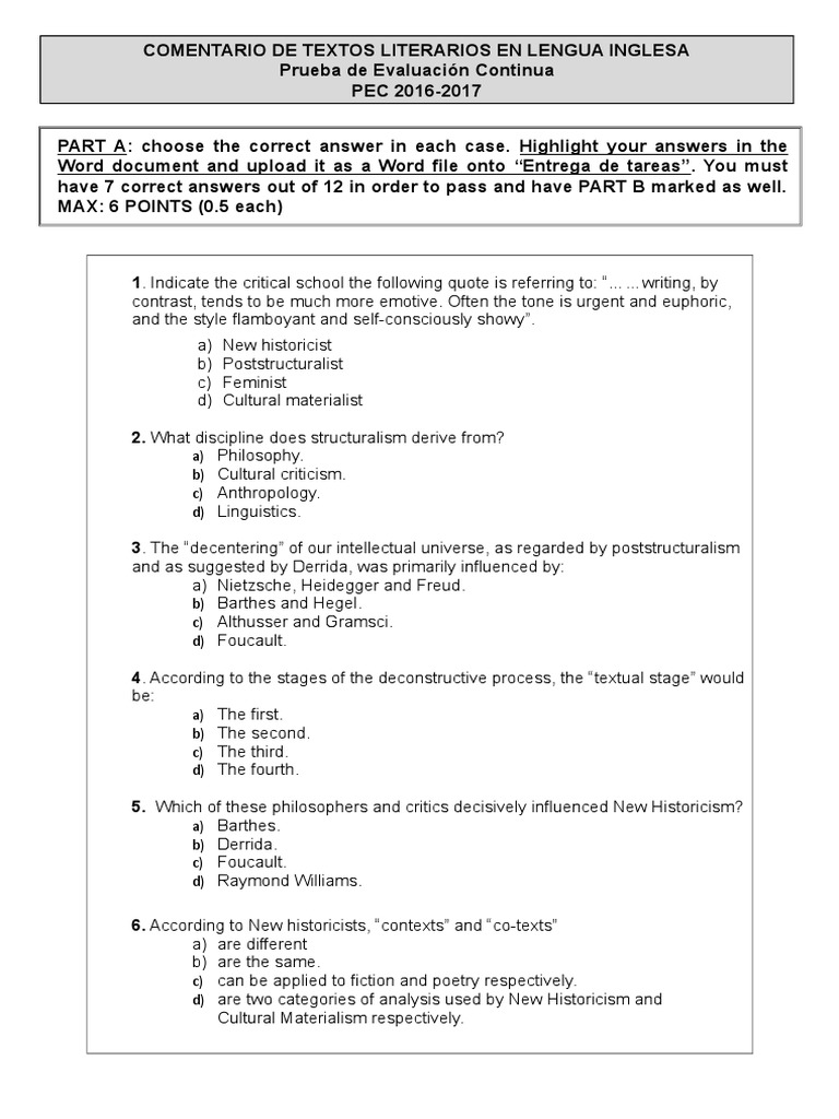 PART B FOLLOWS ON THE NEXT PAGE. Roland Barthes relates the ideology of capitalism to the figure of …. satire or epic? a) Greenblatt. END OF PART A. b) American Modernist poet. 10. . c) Barthes. d) the author. c) the editor. d) Korean War texts. tragedy. c) British Inter-War poet. c) looks for abstraction in the signifier. b) First World War texts. romance. Elizabeth Bishop was a a) British Modernist poet. Who wrote that historical texts can be read as narratives that correspond to the diverse literary genres of comedy. 11. b) Hayden White. 12. a “transcendent reading” a) searches for the signified outside the text. c) Vietnam War texts. d) Foucault.. d) tries to move deep into the text. b) the philosopher. d) American post-World War II poet. …… wrote that the intention and objective of his critical school was “an intensified willingness to read all of the textual traces of the past with the attention traditionally conferred only on literary texts” a) Derrida b) Greenblatt c) Barthes d) Foucault 9. According to Derrida. 8. a) the critic. From a New historicist approach Bishop’s poem “12 O’Clock News” can be studied in relation to a) World-War II texts. b) searches for the spirituality within the text.7.