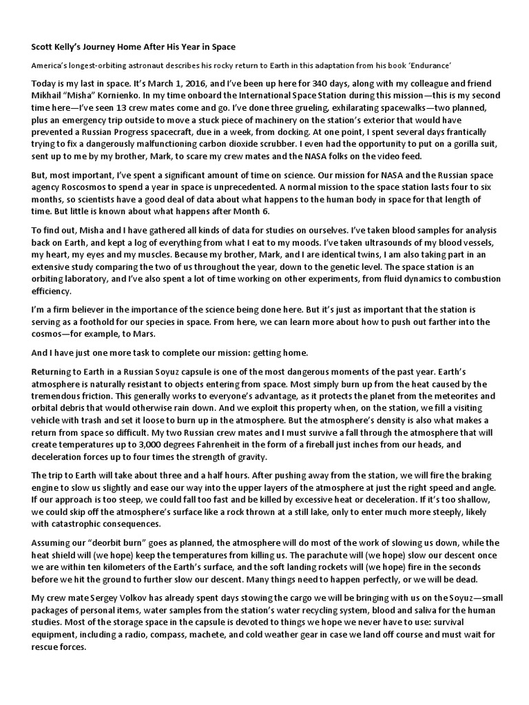 return from space so difficult. My two Russian crew mates and I must survive a fall through the atmosphere that will