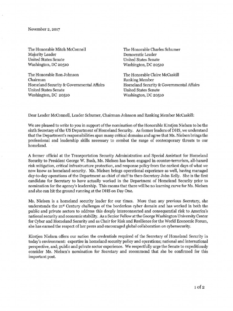 Kirstjen Nielsen Former DHS Secretaries Letter of Support