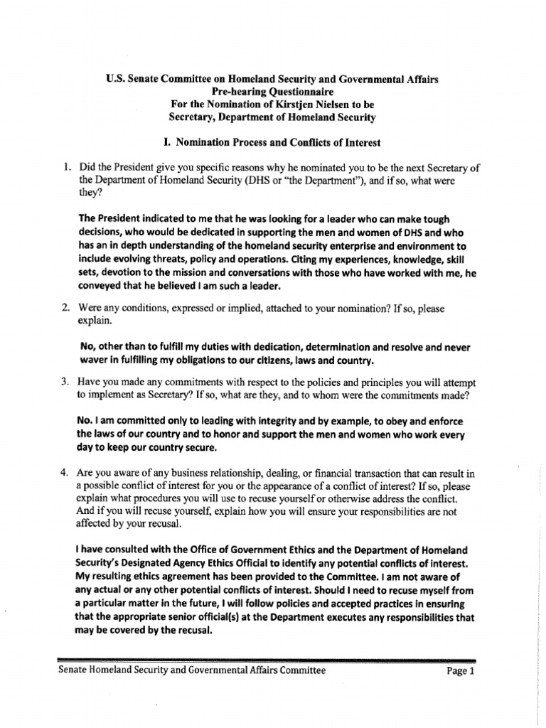Kirstjen Nielsen's written policy questions for HSGAC confirmation hearing