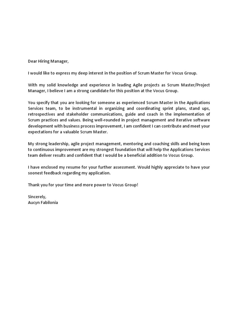 I would like to express my deep interest in the position of Scrum Master for Vocus Group.