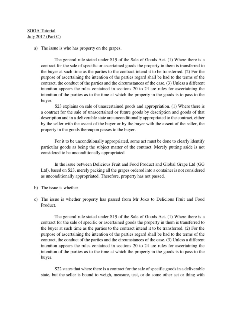 c) The issue is whether property has passed from Mr Joko to Delicious Fruit and Food
