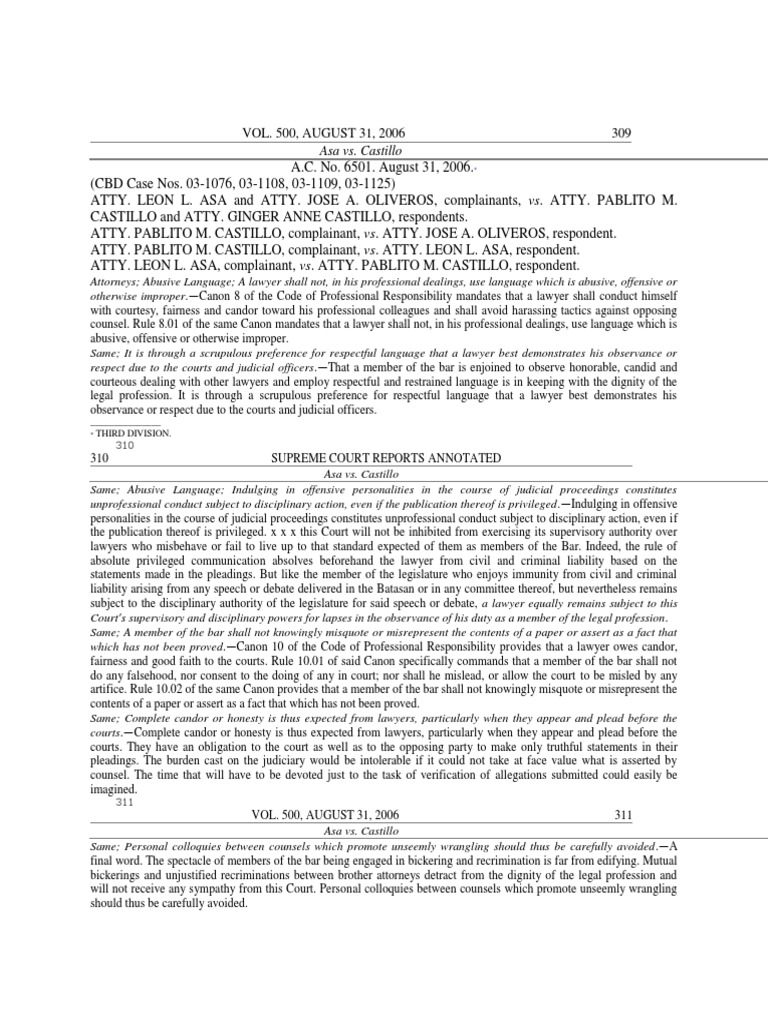 Asas reputation, Asa and Oliveros filed before IBP an administrative complaint3 against Castillo and