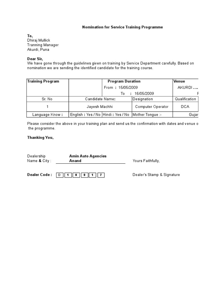 nomination we are sending the identified candidate for the training course.
