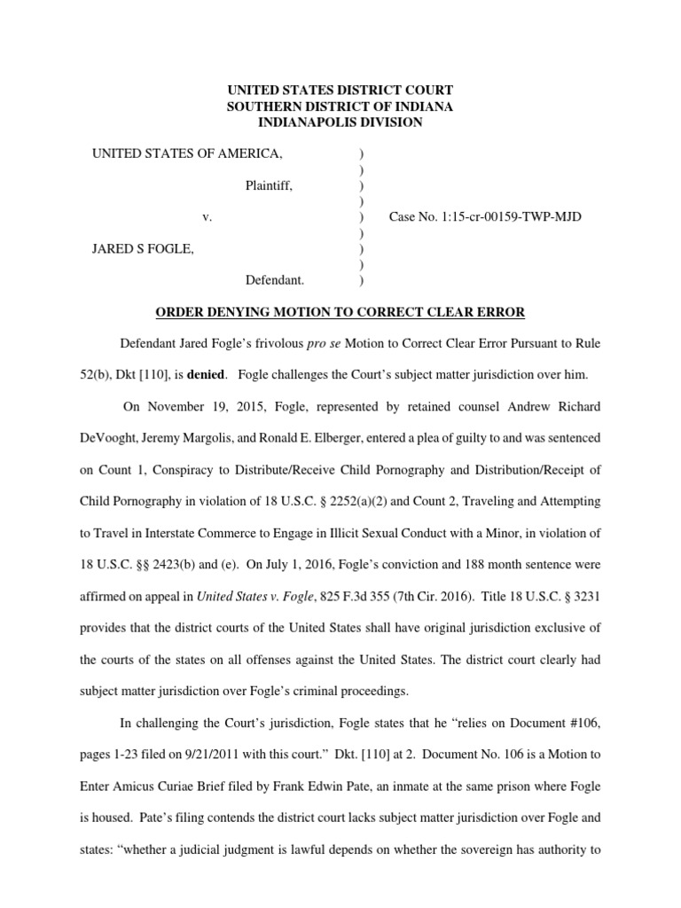 , 825 F.3d 355 (7th Cir. 2016). Title 18 U.S.C. § 3231 provides that the district courts of the United States shall have original jurisdiction exclusive of the courts of the states on all offenses against the United States. The district court clearly had subject matter jurisdiction over Fogle’s criminal proceedings. In challenging the Court’s jurisdiction, Fogle states that he “relies on Document #106, pages 1-23 filed on 9/21/2011 with this court.” Dkt. [110] at 2. Document No. 106 is a Motion to Enter Amicus Curiae Brief filed by Frank Edwin Pate, an inmate at the same prison where Fogle is housed. Pate’s filing contends the district court lacks subject matter jurisdiction over Fogle and states: “whether a judicial judgment is lawful depends on whether the sovereign has authority to