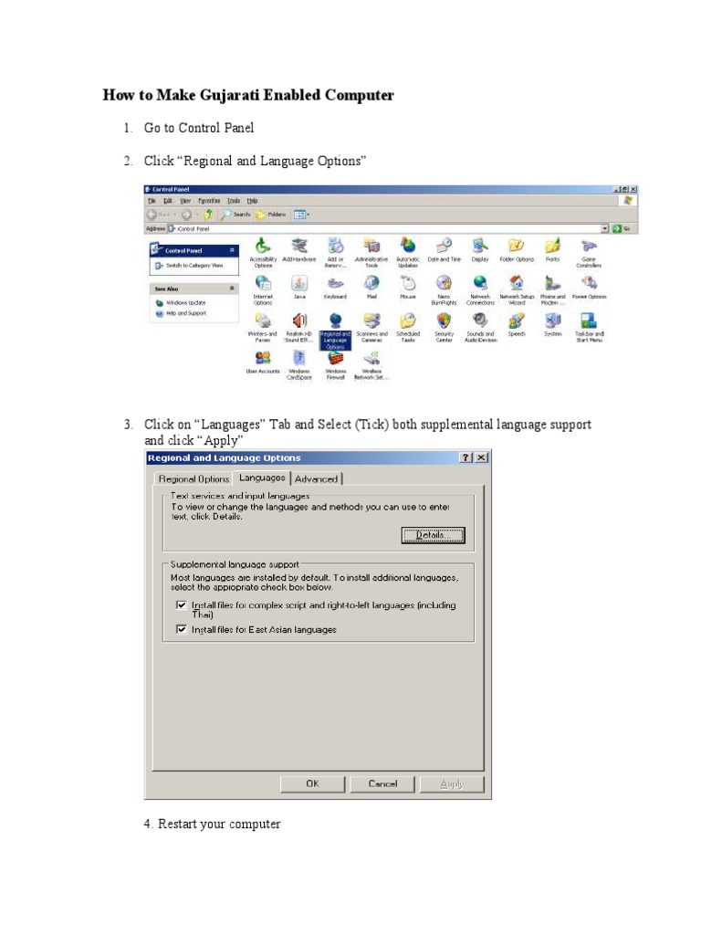 To enable Gujarati on your computer, go to the Control Panel, open the Regional and Language Options, select the Languages tab, tick the boxes for supplemental language support, apply the changes, and then restart your computer to complete the setup.