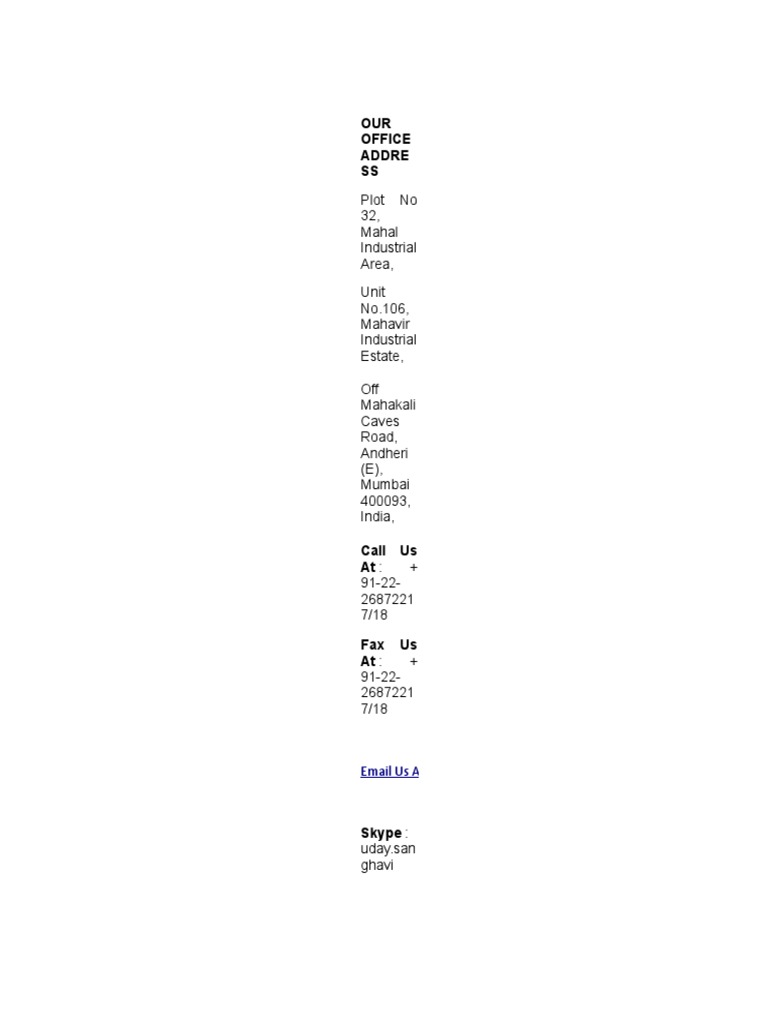 This document provides contact information for an office located in Mumbai, India, including the plot and unit numbers for the industrial estate address, the phone and fax numbers, an email address, and a Skype contact.