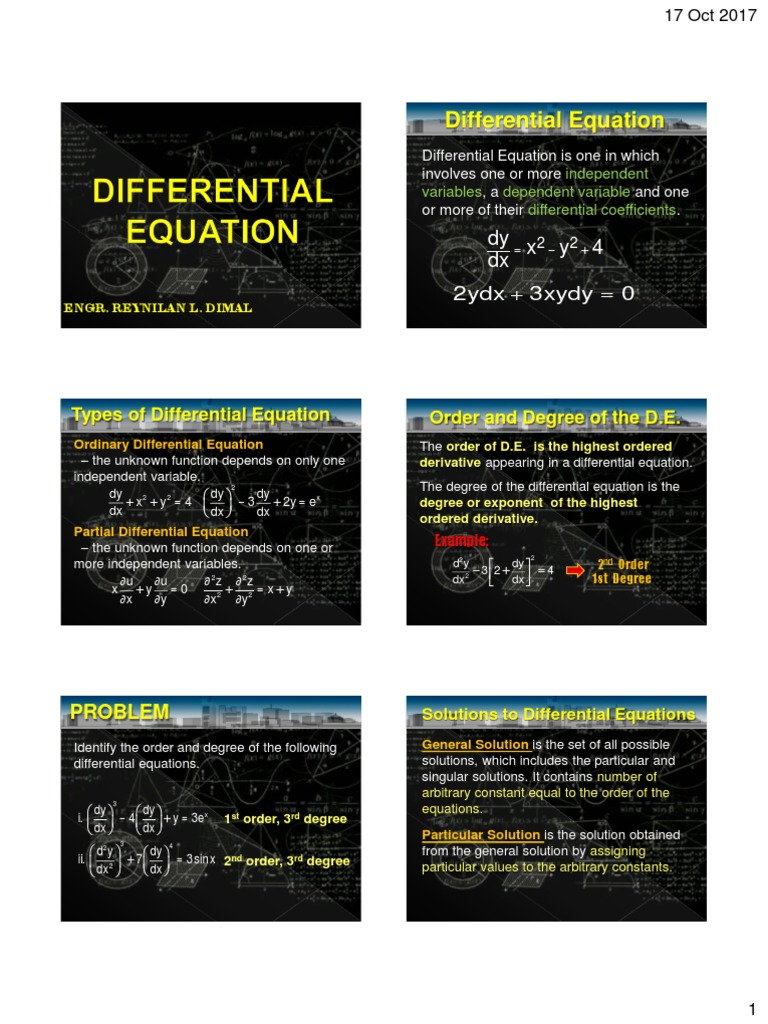 Ordinary Differential Equation The order of D.E. is the highest ordered