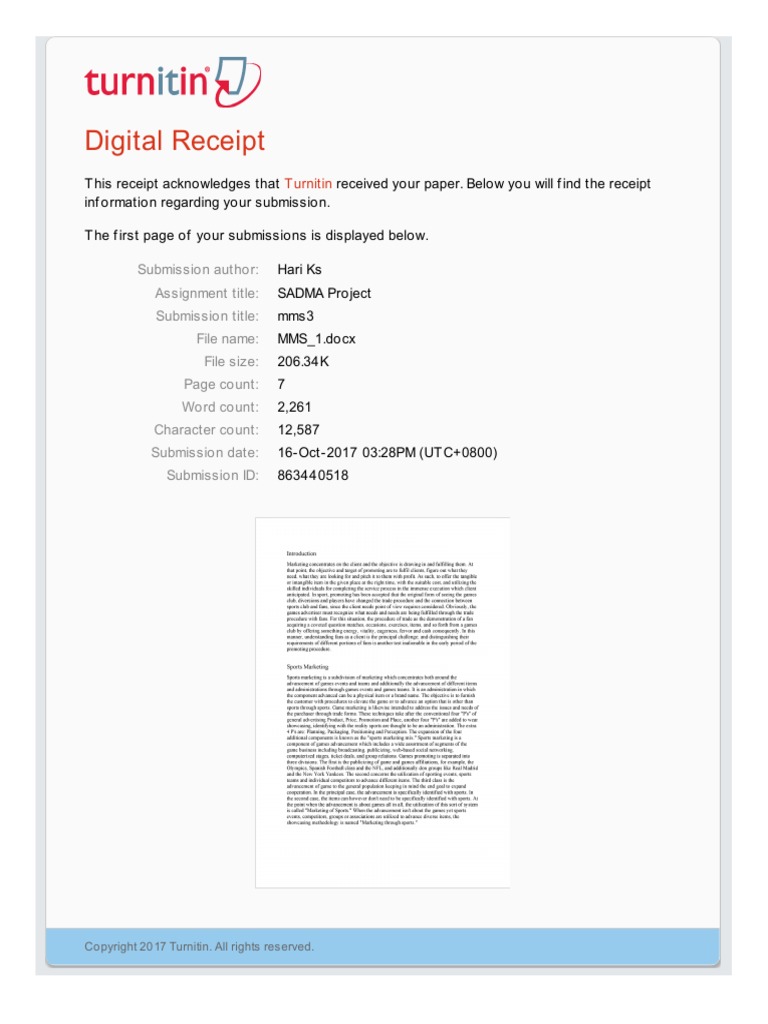 T his receipt acknowledges that T urnitin received your paper. Below you will f ind the receipt