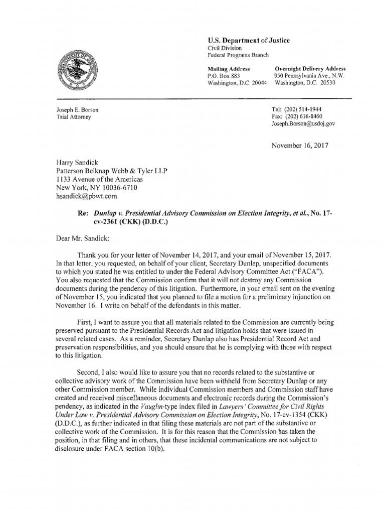 Re: Duntap v. Presidential Advisory Commission on Election Integrity, et al., No. 17~