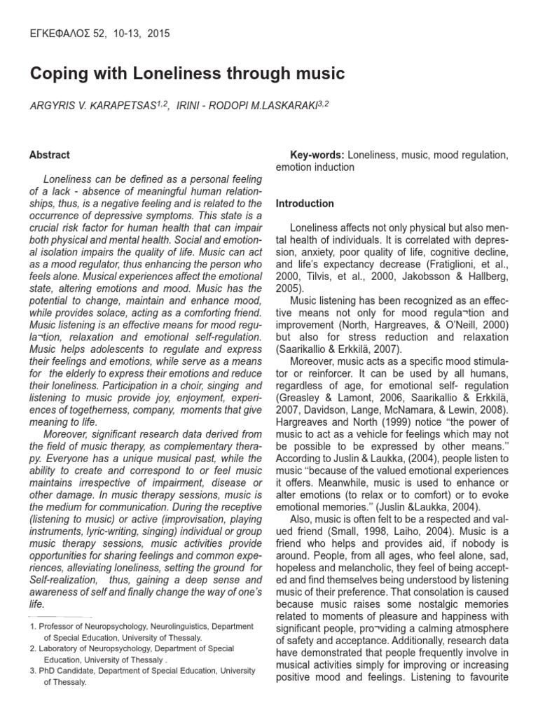 feels alone. Musical experiences affect the emotional 2000, Tilvis, et al., 2000, Jakobsson & Hallberg,