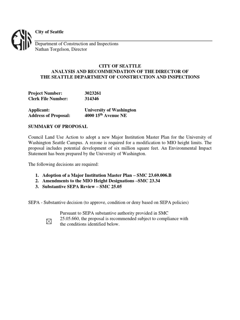 CITY OF SEATTLE ANALYSIS AND RECOMMENDATION OF THE DIRECTOR OF THE SEATTLE DEPARTMENT OF CONSTRUCTION AND INSPECTIONS Project Number: 3023261 Clerk File Number: 314346 Applicant: University of Washington Address of Proposal: 4000 15