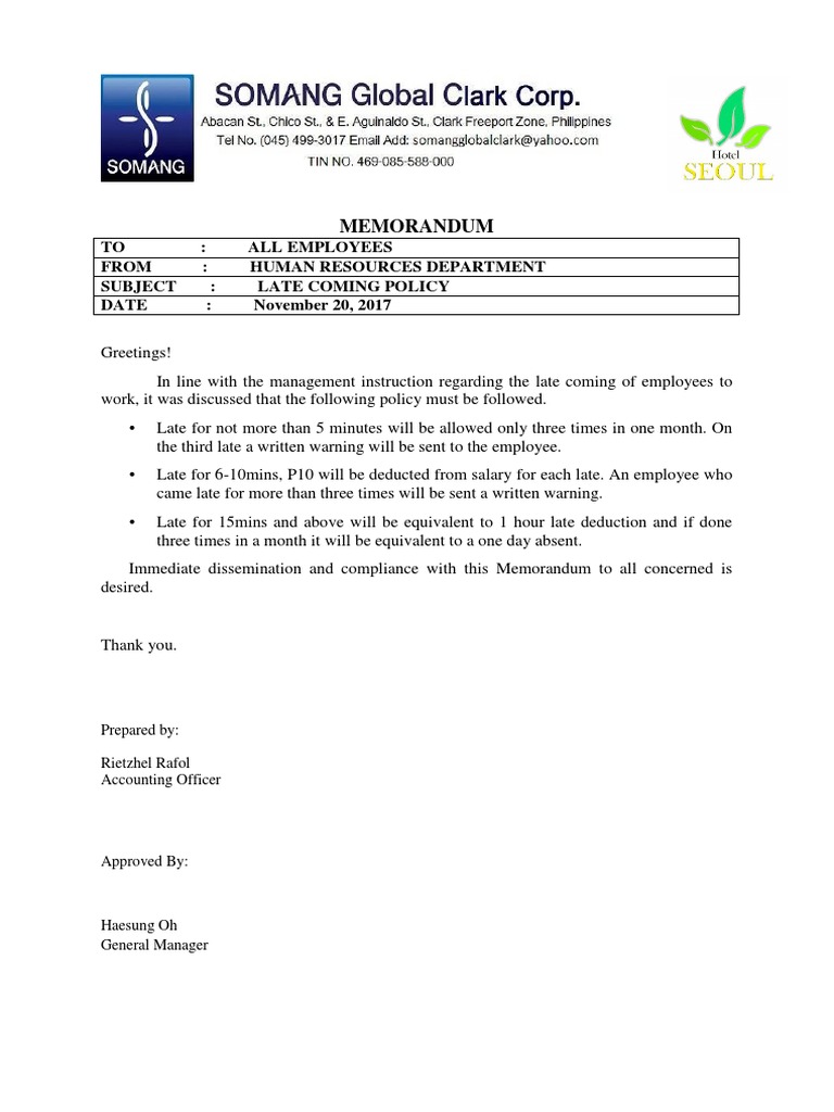 Late for 6-10mins, P10 will be deducted from salary for each late. An employee who