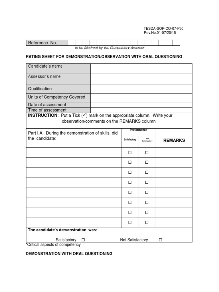 RATING SHEET FOR DEMONSTRATION/OBSERVATION WITH ORAL QUESTIONING