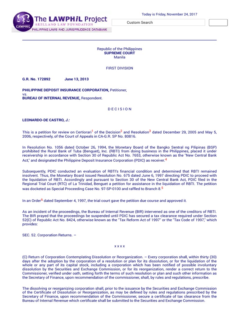 The BIR prayed that the proceedings be suspended until PDIC has secured a tax clearance required under Section