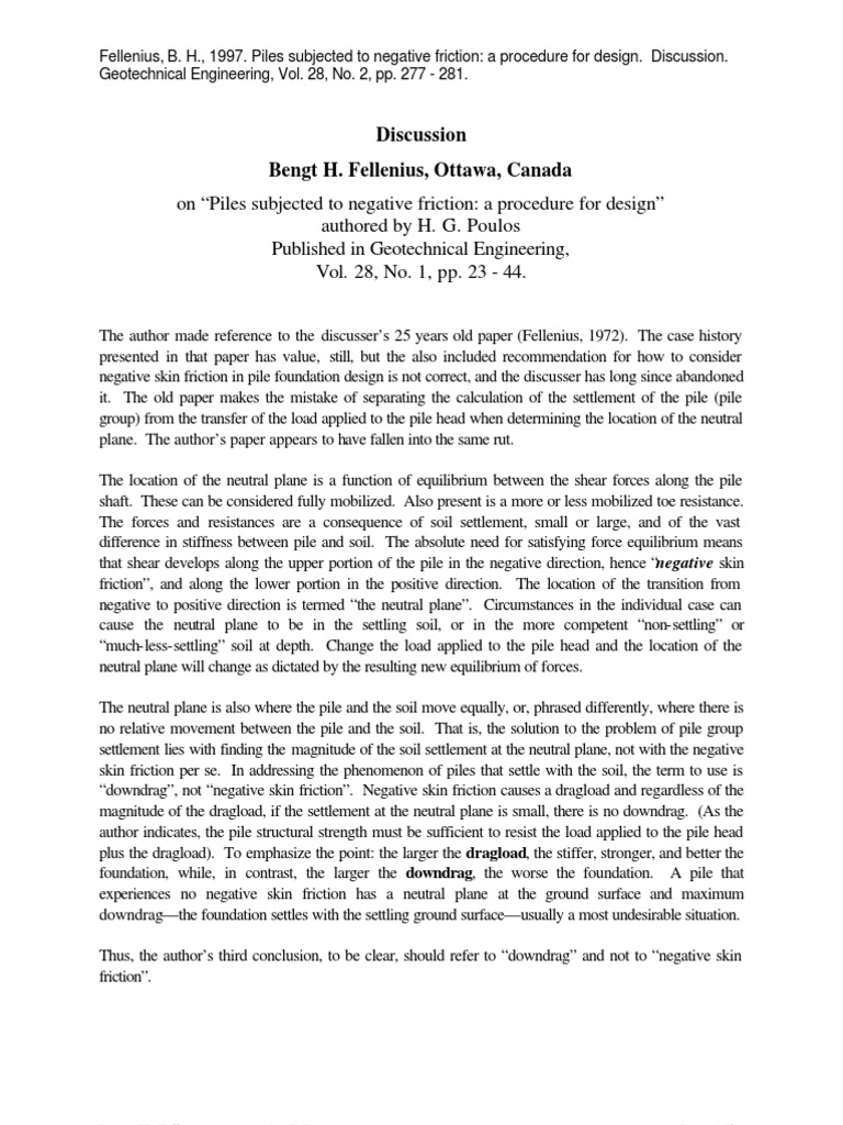 Fellenius, B. H., 1997. Piles subjected to negative friction: a procedure for design. Discussion.