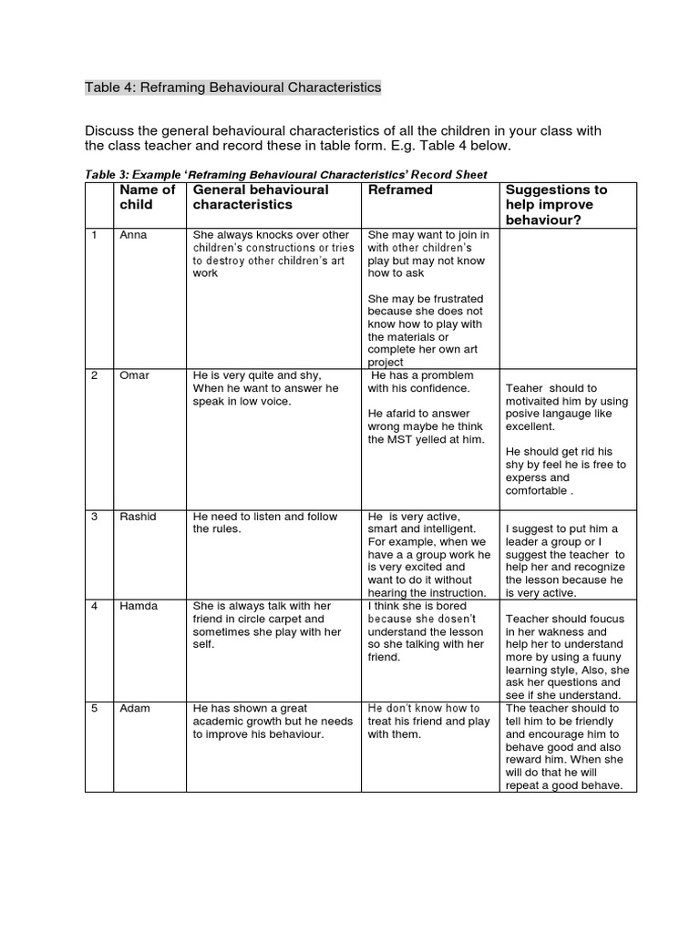 Table 4: Reframing Behavioural Characteristics