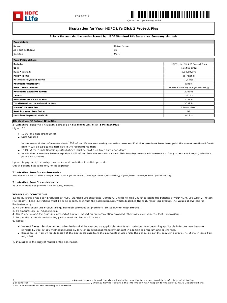 1.This illustration has been produced by HDFC Standard Life Insurance C ompany Limited to help you understand the benefits of your HDFC Life C lick 2 Protect
