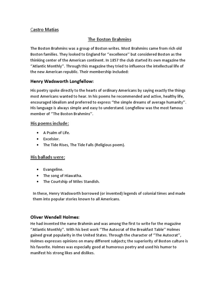 The Boston Brahmins was a group of Boston writes. Most Brahmins came from rich old