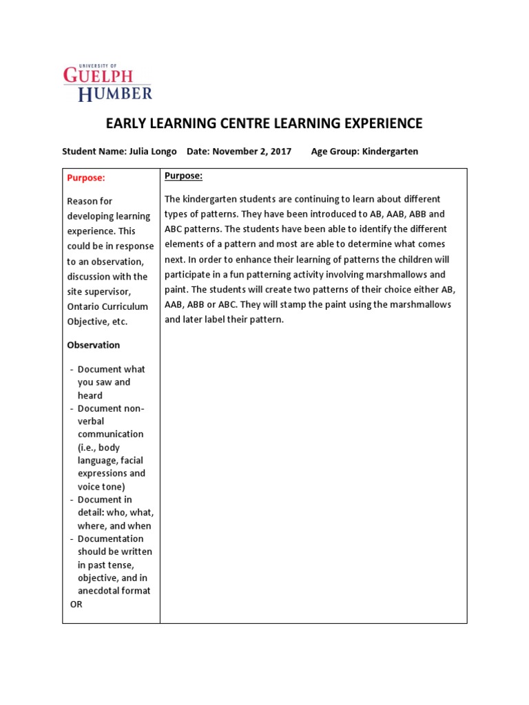 Student Name: Julia Longo Date: November 2, 2017 Age Group: Kindergarten