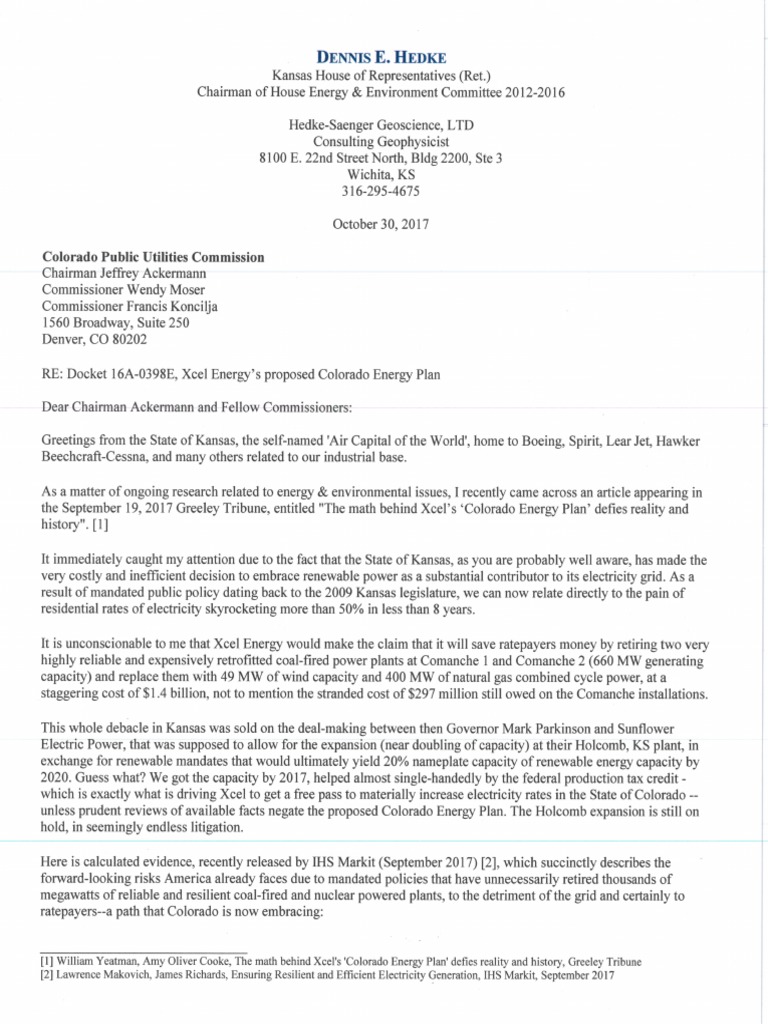 Rep Hedke letter to COPUC opposing Xcel's Colorado Energy Plan